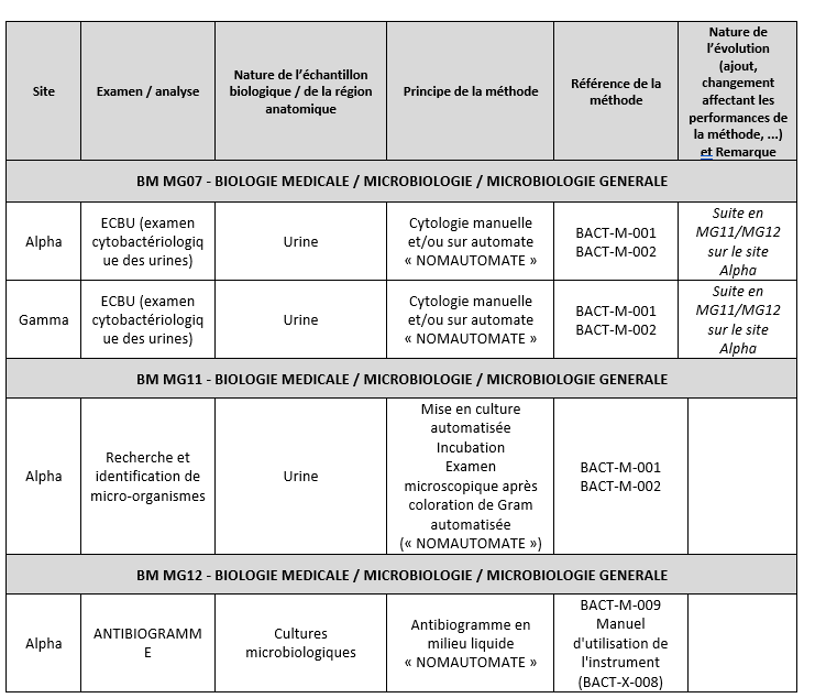 Phases Pré et Post-analytiques en biologie médicale : enregistrement de la nouvelle ligne de portée BM PP01 sur l’application Flexi+ Suite à la révision du document SH REF 08 (cf. lien actualité), la réalisation des phases pré- et post-analytiques de l’ensemble de l’activité de biologie médicale du LBM est couverte par deux nouvelles lignes de portée BM PP01 & BM PP02. Seule la ligne BM PP01 décrivant les prélèvements effectués par le personnel du LBM soit en son sein soit à l’extérieur doit être complétée par une portée détaillée. Pour rappel, celle-ci était à enregistrer dans la partie « demande d’extension » de l’application Flexi+ au plus tard pour le 31/12/2024. Pour vous faciliter l’intégration de la portée détaillée correspondant à une demande d’extension, une amélioration a été apportée à l’application Flexi+ permettant l’intégration massive des lignes de portée détaillée. Vous trouverez ci-dessous les liens vers les fiches mémo : |